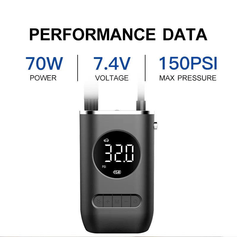 4. Full screen digital display: The display screen of the inflation pump can display information such as pressure and power, making it convenient for users to understand the working status of the inflation pump.